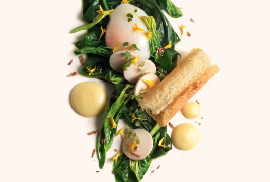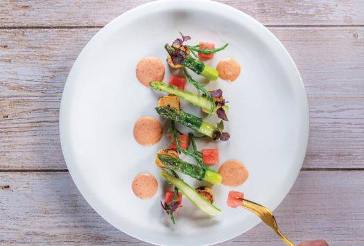 Bambou façon crème brûlée, asperges vertes, béarnaise aux baies de Goji