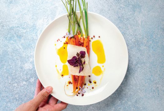 Blanc de cabillaud cuit basse température, jeunes carottes glacées au gingembre et baies...