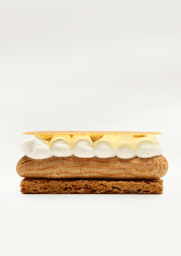 Le Saint-Honoré. L’image est belle, 50 % du volume du produit c’est de la crème nature, apparente, juste pochée dessus, avec une fine couche de caramel qui la chapote et c’est tout.