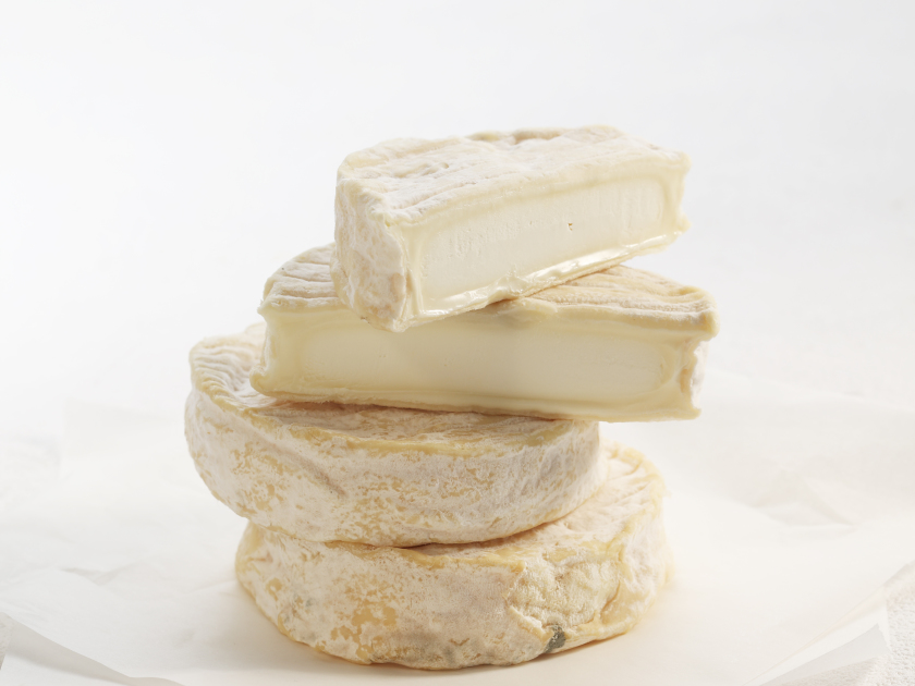 Soft-ripened cheese with a rather regular, thin bloomy rind of a creamy yellow to off-white color.