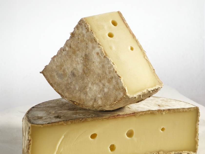 Tome des Bauges features a relatively thick, rugged gray rind on which yellow, red, pink or white molds can form. Its paste is homogenous and yellow with small holes.