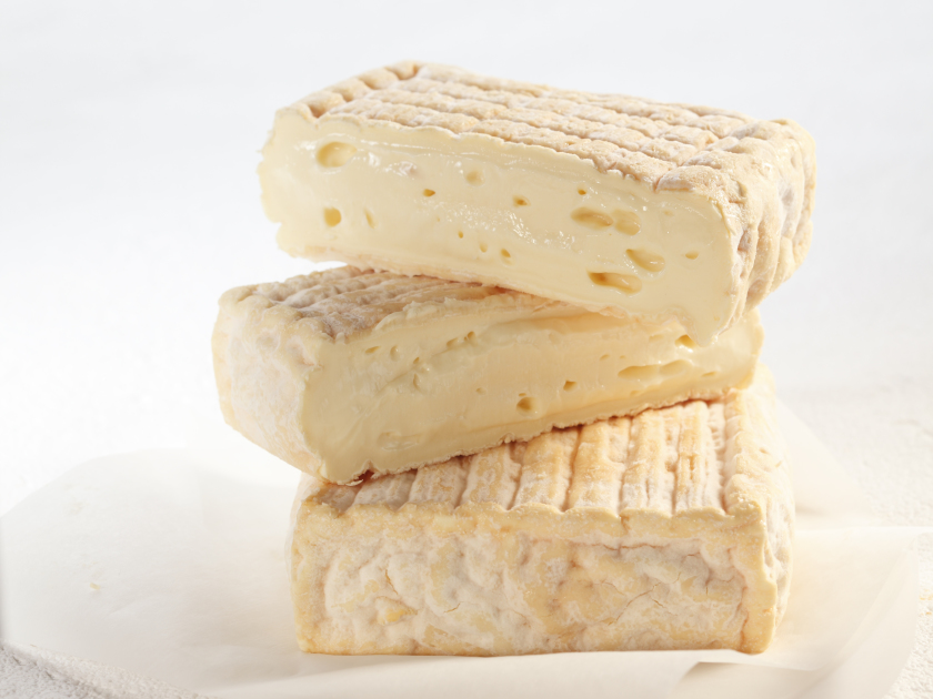 L’épaisse croûte blanche bien duveteuse protège une pâte souple, onctueuse et brillante, de couleur blanc cassé à jaune clair parsemée de petits trous.